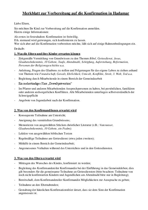 Die Konfirmation in Hadamar findet in der Schlosskirche statt. Und zwar am Sonntag vor Himmelfahrt. Der Vorstellungsgottesdienst ist in der Regel eine Woche vorher. Die Anmeldung zur Konfirmation und zum Unterricht ist im Frühjahr des Vorjahres. Der Termin wird im Gemeindebrief bekanntgegeben. Außerdem werden die Familien, die nach unseren Unterlagen betroffen sind (Konfirmation mit 14 Jahren) frühzeitig angeschrieben.