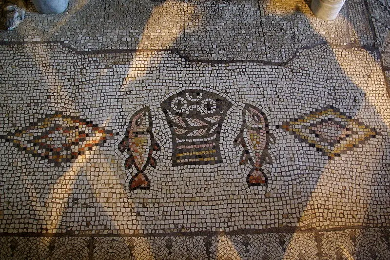 Dieses Mosaik befindet sich in der Brotvermehrungskirche in Tabgha, einer Ortschaft am Nordufer des See Genezareth in Galiläa. Hier ist eine christliche Pilgerstätte, die mit dem Wirken Jesu, insbesondere der überlieferten Brotvermehrung (Mt.14, 13-21) in Verbindung gebracht wird. Uralt sind die Zeichen der Gastfreundschaft, das Bild von Schale und Becher, von Essen und Trinken, von Geben und Nehmen macht uns deutlich: Es entsteht eine Gemeinschaft zusammengehöriger Menschen.